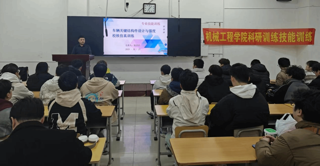 10月27日下午,学院团委举办了“车辆关键结构件设计与强度校核仿真”主题技能训练,本次讲座由陈洪岩老师主讲,旨在深化同学们对车辆结构设计核心技术的理解,提升工程仿真与强度校核应用能力,助力汽车产业高质量发展。参加本次讲座的为车辆工程23级1-3班的同学
