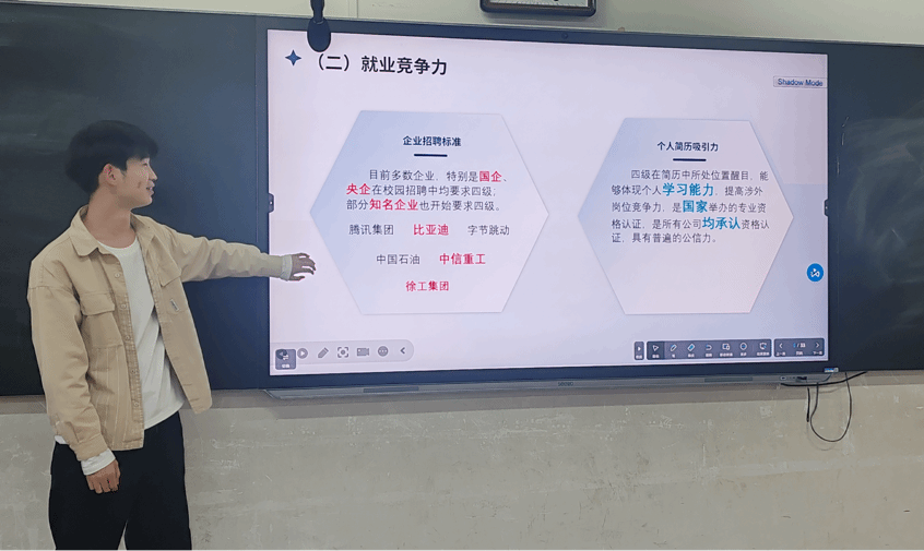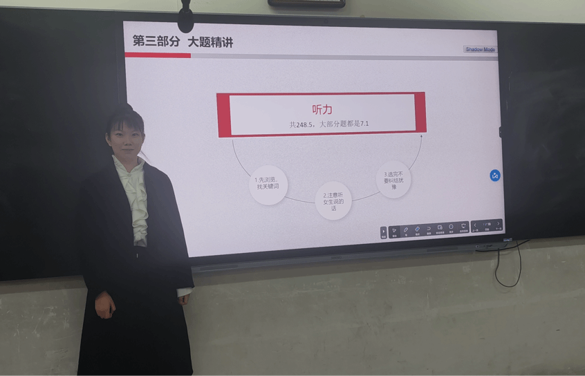 讲座过程中,两名备考经验丰富的学长以及大一同学分享了他们的四六级考试心得体会,详细介绍了考试的最新趋势和高效的备考方法。从听力抓分技巧到阅读理解策略,再到写作与翻译的实用经验,他们结合自己的备考历程,深入浅出地传授了切实可行的提分秘诀。学长学姐们特别强调了科学规划备考计划和坚持日常积累的重要性,鼓励同学们通过不断阅读和练习,提升综合语言能力。