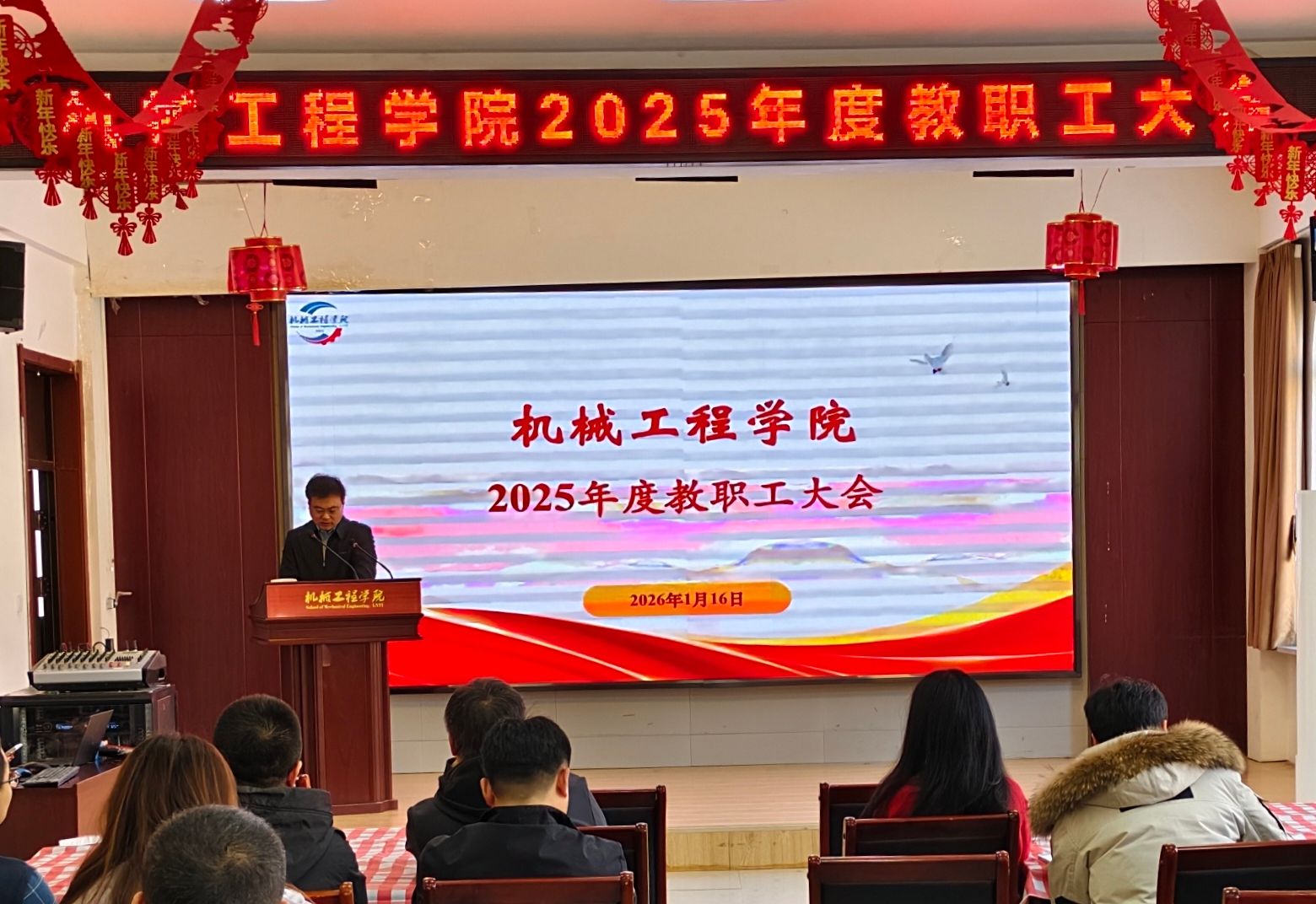 会上,院长杨新乐作2025年度工作报告。报告全面回顾了学院2025年在学科建设、人才培养、科研攻关、师资队伍建设等核心领域取得的突破性进展,通过详实数据直观呈现了教学质量稳步提升、科研项目高效落地、学生就业质量显著提高等一系列亮眼成果。同时,报告明确了2026年学院重点工作任务,部署了具体攻坚举措,为全院全年工作开展绘就了清晰蓝图、指明了前进方向。